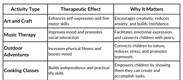 Cooking Classes: Cooking not only teaches practical life skills but also offers a sensory experience that can be therapeutic. Children can build confidence by creating their own meals.